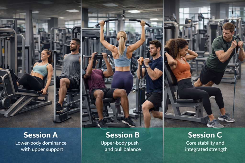 This guide introduces a full-body, three-day strength plan built for beginners who want structure without noise. The routine is programmatic, not motivational. Each session has a purpose, each exercise earns its place, and progress follows predictable rules.